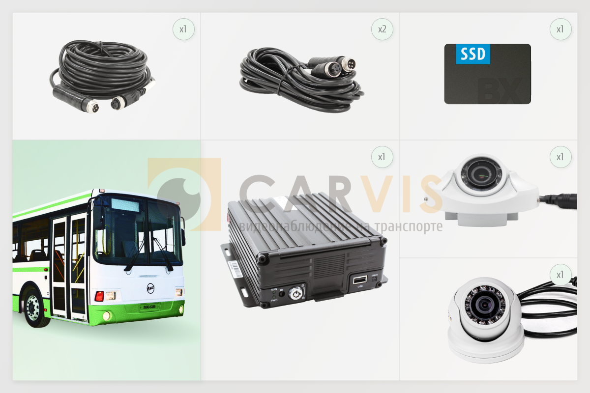 Предложенный комплект представляет собой стандартное решение для видеонаблюдения в автобусах большого класса (3 двери). В зависимости от конкретных потребностей вашей организации и особенностей автобуса, можно создать индивидуальный комплект видеонаблюдения.