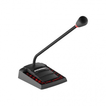 Пульт оснащен светодиодной индикацией красного цвета на стойке микрофона, сигнализирующей о нажатии кнопки "Говорить" и передаче голосовых сообщений. Питание осуществляется от источника постоянного тока 48 В.