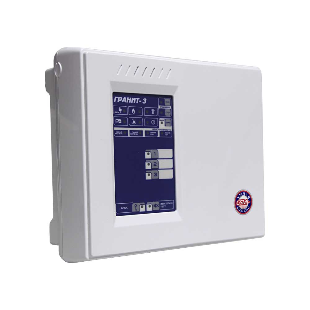 Контрольный прибор «Сибирский Арсенал» «Гранит-3А GSM» рассчитан на три шлейфа сигнализации. Укомплектован GSM-коммуникатором «Гранит» (на 2 SIM–карты). Оповещает о тревоге и других событиях с помощью световых и звуковых оповещателей, сообщений (голосовых или SMS) на мобильный телефон (до 16 номеров). Поддерживает все алгоритмы работы (А, В и С) согласно свода правил СП 484.1311500.2020 «Системы противопожарной защиты. Системы пожарной сигнализации и автоматизация систем противопожарной защиты. Нормы и правила проектирования» (01.03.2021 г).