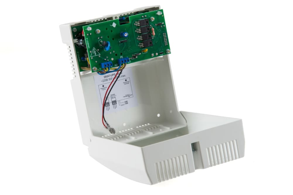 В Skat-UPS 50/40 предусмотрен отсек для аккумуляторной батареи емкостью 7 А·ч (в комплект не входит). В режим резервного питания источник переходит мгновенно, время возврата к питанию от сети составляет 15 с. Напряжение на выходе АКБ — 187 В ~ 242 В. Продолжительность работы на заряде от батареи емкостью 7 А·ч — 1 ч. Для повышения автономности можно подключить внешний аккумулятор, что дает дополнительное время батарейной поддержки при емкости: