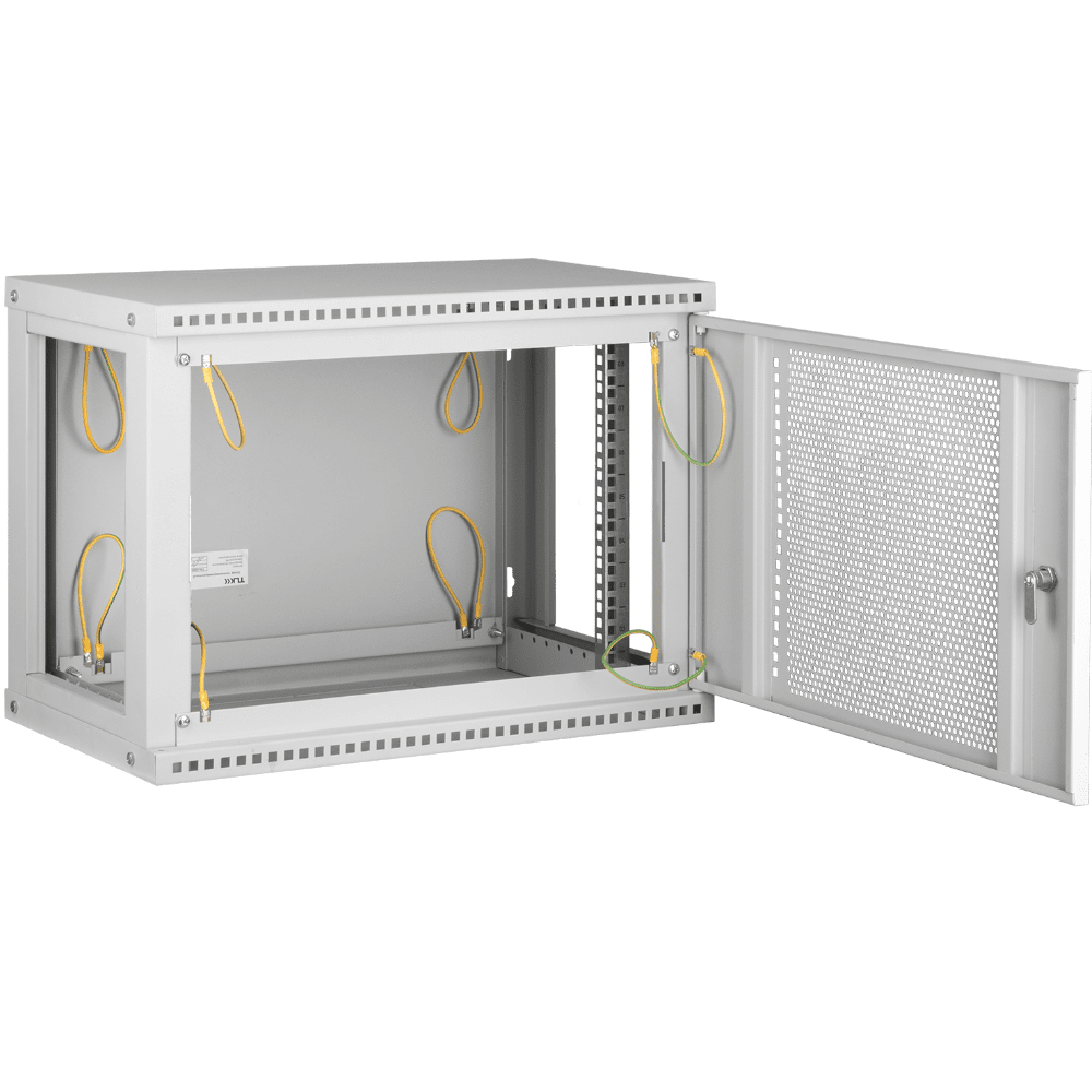 Настенный телекоммуникационный шкаф TLK TWI-066035-R-P-GY представляет собой сборную конструкцию типоразмера 19" с высотой 6U (303 мм) и полезной глубиной 330 мм. Максимальное расстояние между направляющими составляет 232 мм. Шкаф соответствует требованиям стандартов ГОСТ 28601-90 и IEC 297.